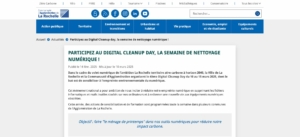 Dans le cadre du volet numérique de l’ambition La Rochelle territoire zéro carbone à horizon 2040, la Ville de La Rochelle et la Communauté d’Agglomération organisent le 4ème Digital Cleanup Day du 10 au 15 mars 2025, dont le but est de sensibiliser à l’empreinte environnementale du numérique.