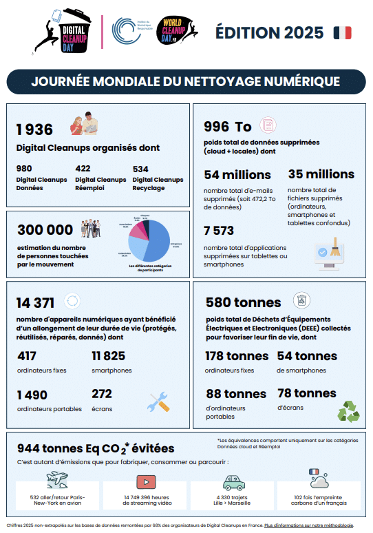 La sixième édition a eu lieu du 10 au 15 Mars 2025. Partout en France, des milliers de citoyennes et citoyens ont été invités à nettoyer leurs données numériques et participer à une collecte d’équipements en vue de leur réemploi ou recyclage. En 2025, ces actions ont permis de supprimer 996 Téraoctets de données, réemployer 14 371 équipements numériques et collecter 580 tonnes de Déchets d’Équipements Électriques et Électroniques (DEEE) afin d’en assurer le recyclage, réduisant ainsi l’empreinte carbone collective.