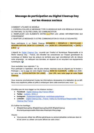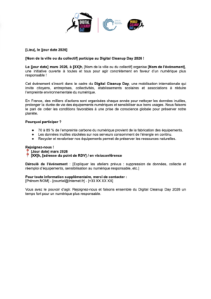 Facilitez votre mobilisation pour le Digital Cleanup Day ! Découvrez nos textes prêts à l’emploi pour inspirer, informer et rallier participants et organisateurs à votre événement.